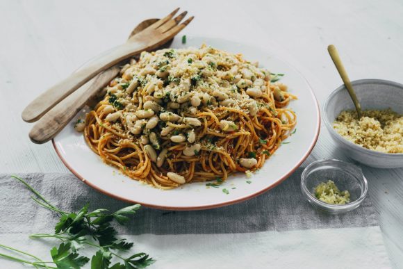 Herbed White Bean and Anchovy Spaghetti with Garlic Breadcrumbs