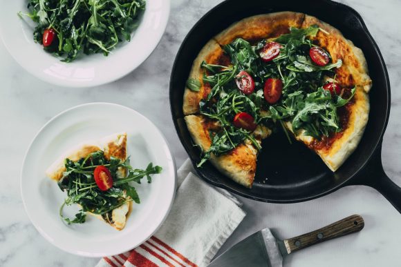 Cast-Iron Tomato Basil Pizza Topped with Fresh Arugula Salad
